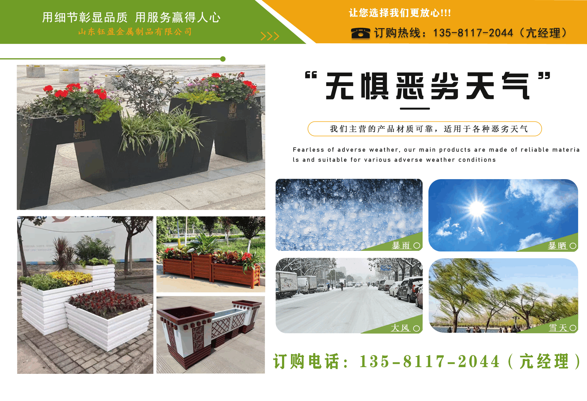 山東鈺盈金屬制品有限公司主營(yíng)鍍鋅板花箱,道路隔斷花箱,定制花箱,戶(hù)外道路花箱,花箱座椅等產(chǎn)品,產(chǎn)品結(jié)構(gòu)合理、性能優(yōu)良,具有強(qiáng)度高、耐腐蝕、抗老化、隔熱隔音、節(jié)約能源、外形美觀、使用壽命長(zhǎng)等優(yōu)點(diǎn),深受?chē)?guó)內(nèi)外客戶(hù)認(rèn)可?! ∥覀兏鶕?jù)客戶(hù)所在城市的文化特征,制造出符合當(dāng)?shù)爻鞘形幕瘹庀⒌淖匀涣Ⅲw、觀賞性強(qiáng)的花箱產(chǎn)品成為城市里一道靚麗的風(fēng)景線?! 」緦?shí)行誠(chéng)實(shí)、公正、守信、價(jià)格合理、平等互利。 公司憑借雄厚經(jīng)驗(yàn)實(shí)力,恪守誠(chéng)信為本的原則,得到了眾多客戶(hù)的信賴(lài),并在業(yè)界獲得良好的口碑。建立了穩(wěn)固的合作關(guān)系,隨著業(yè)務(wù)的不斷發(fā)展和壯大,合作伙伴的范圍也在不斷擴(kuò)大。我們熱情盼望與您的合作,為社會(huì)的可持續(xù)發(fā)展獻(xiàn)上一份努力。...